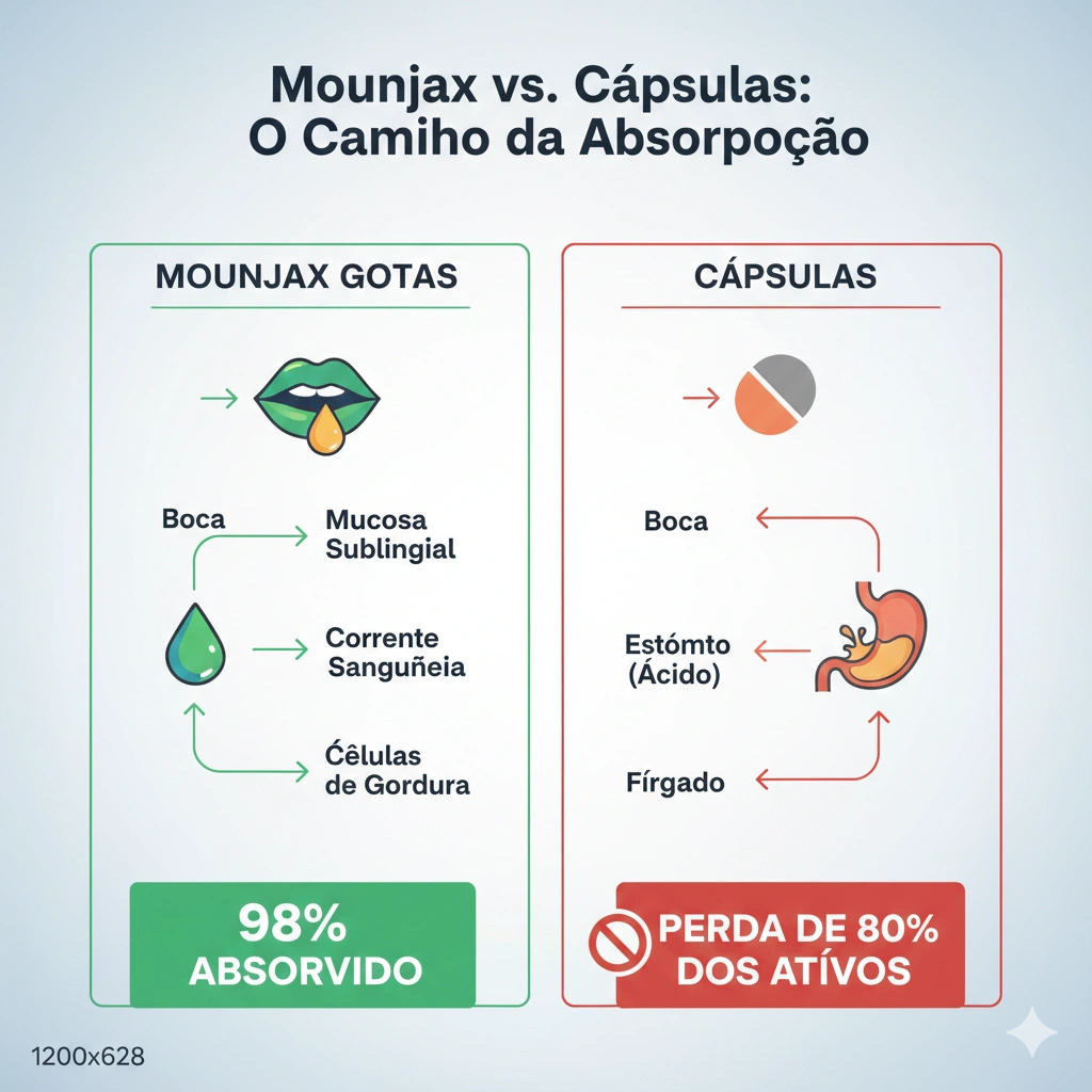 Nesta análise, vamos entender como o Mounjax se propõe a “soltar esse freio” através de uma via de absorção que muitos ainda desconhecem, mas que os especialistas apontam como o futuro da suplementação: a via sublingual.